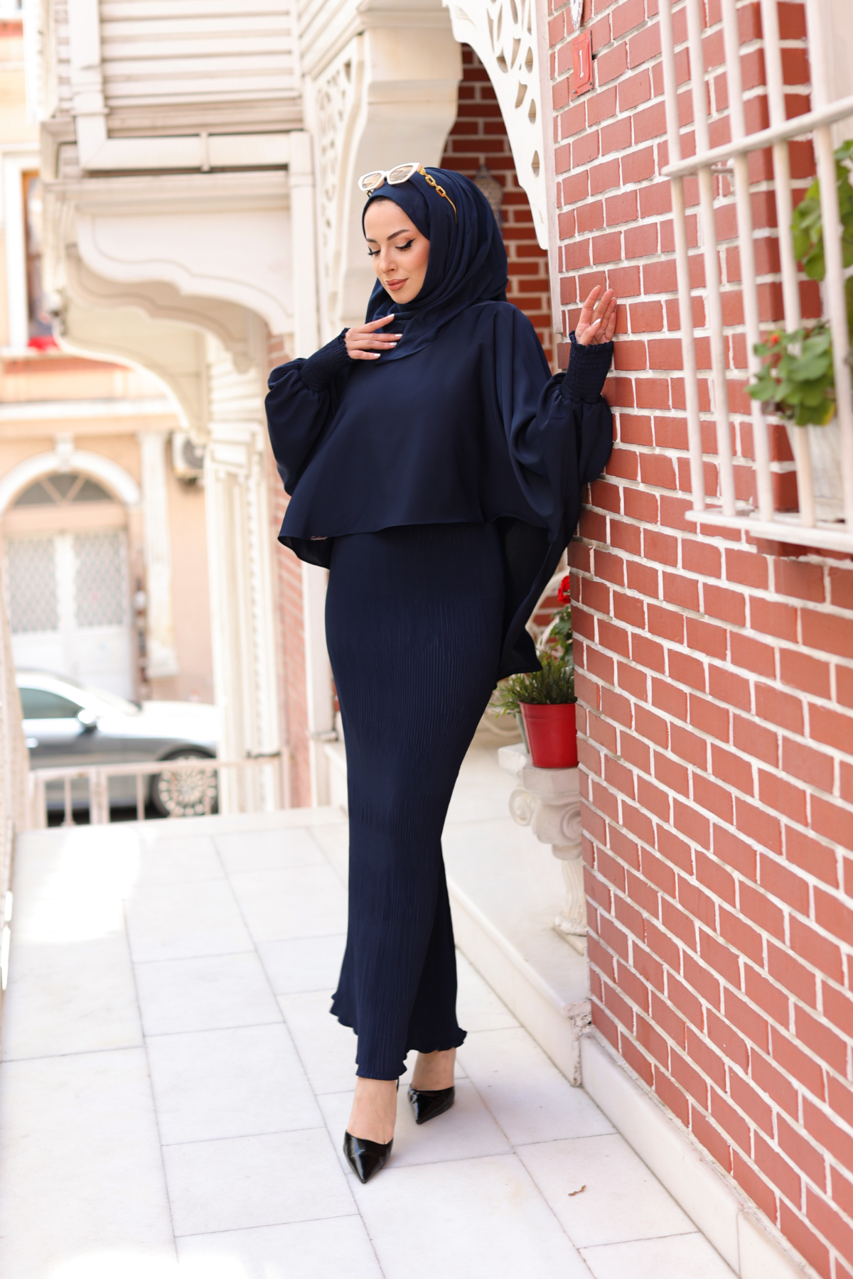 Elegant Dubai İpeği Pelerin Takım Lacivert-8014