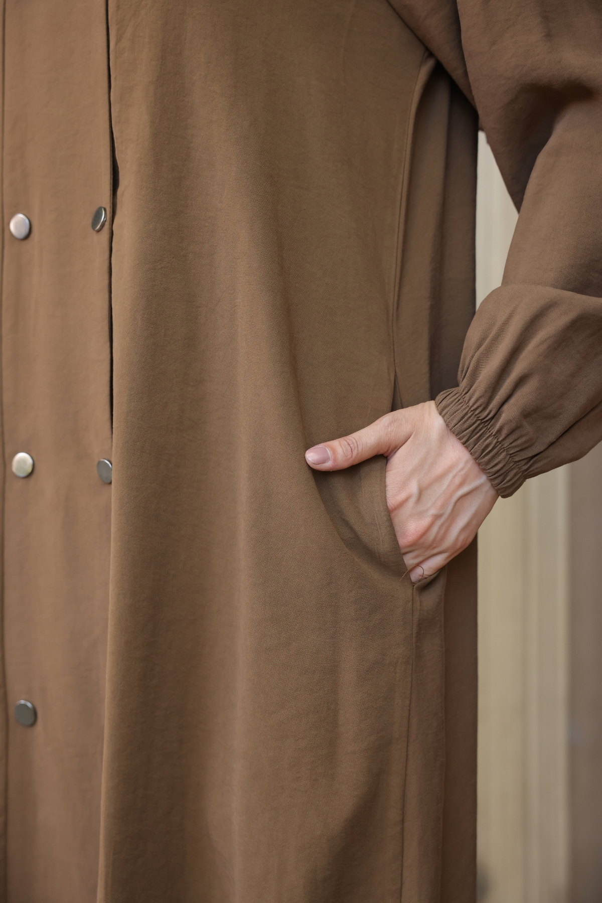 9046 kodlu çift çıtçıtlı kap, 40-50 beden aralığında sunulmakta olup modal viskon kumaştan üretilmiştir. Hafif ve dökümlü yapısıyla gün boyu konfor sağlarken, modern tasarımıyla zarif bir duruş sunar. Ön kısmında yer alan çift çıtçıt detayı, ürüne şık bir görünüm kazandırırken kullanım kolaylığı da sağlar.
