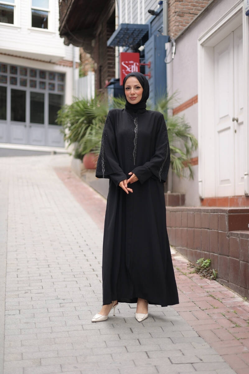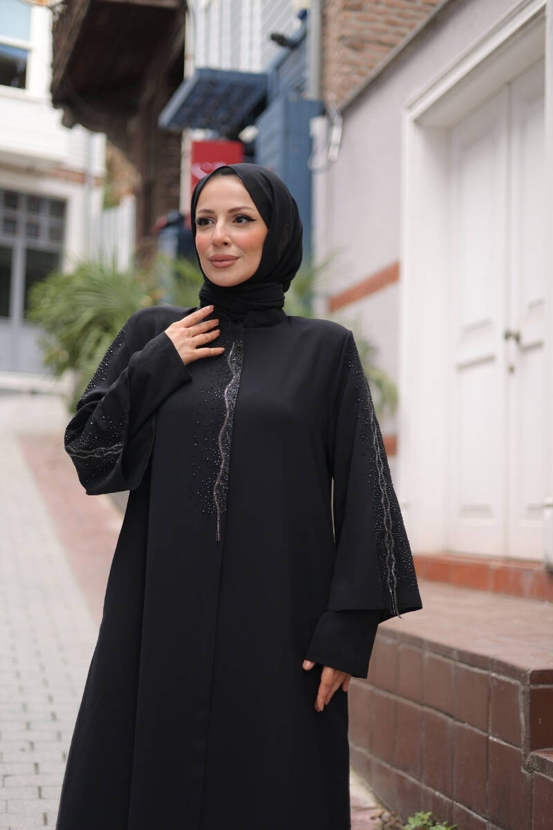 Kol ve ön kısmındaki taş işlemeler, modele ışıltılı bir dokunuş kazandırırken, sade kesimiyle her ortamda zarif bir duruş sergiler. Günlük kullanımdan özel davetlere kadar her anınıza uyum sağlayan bu ferace, rahat kesimiyle özgür hareket imkânı sunar.