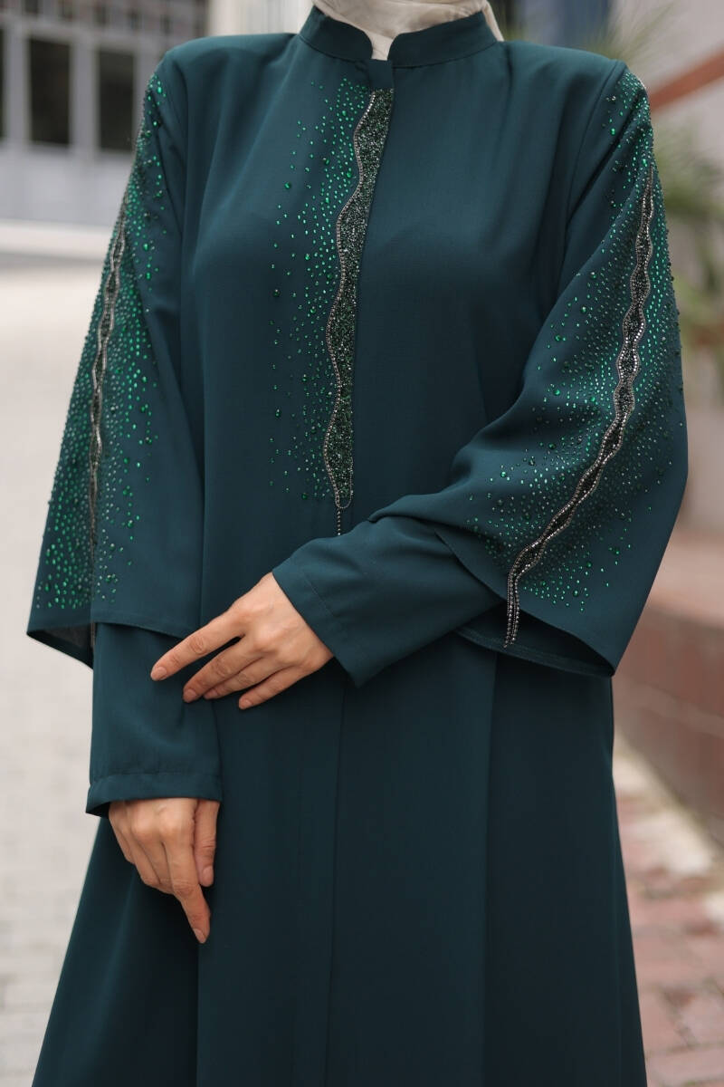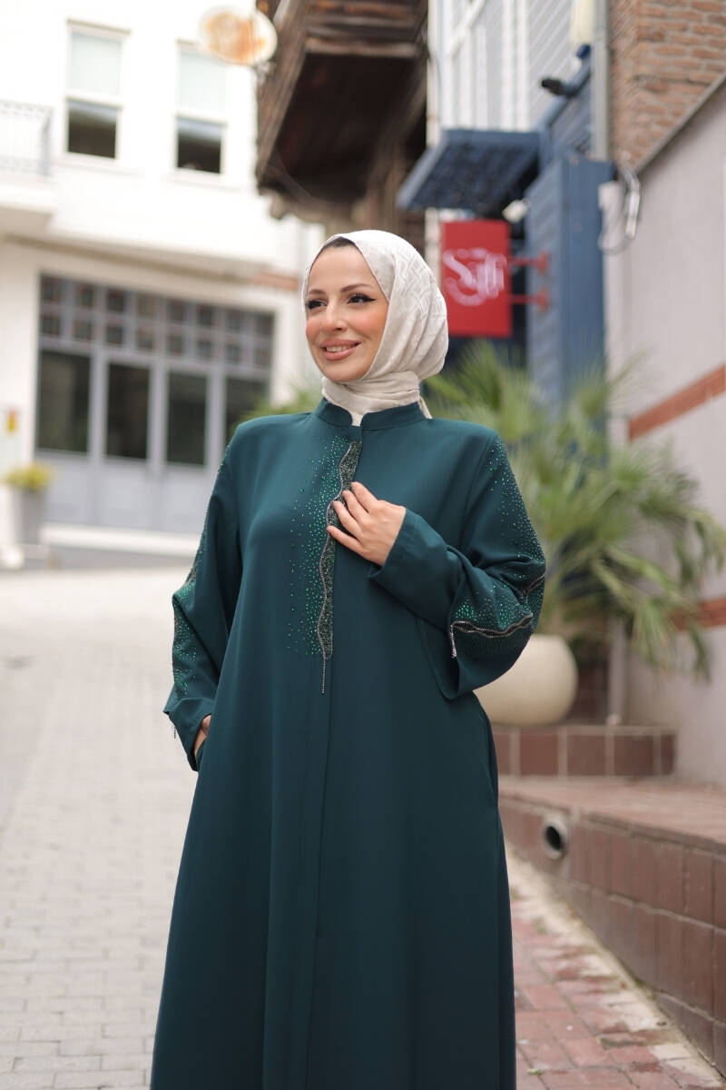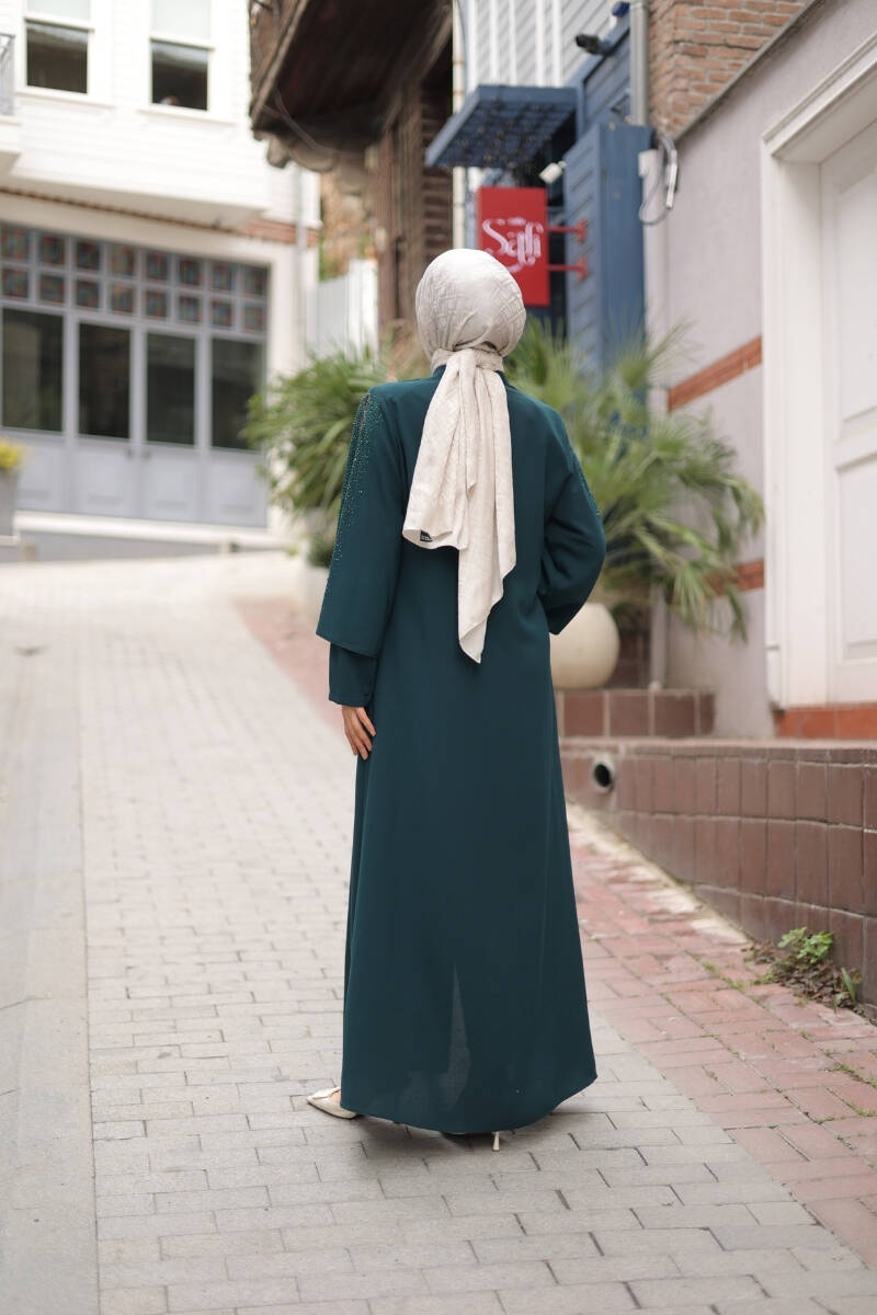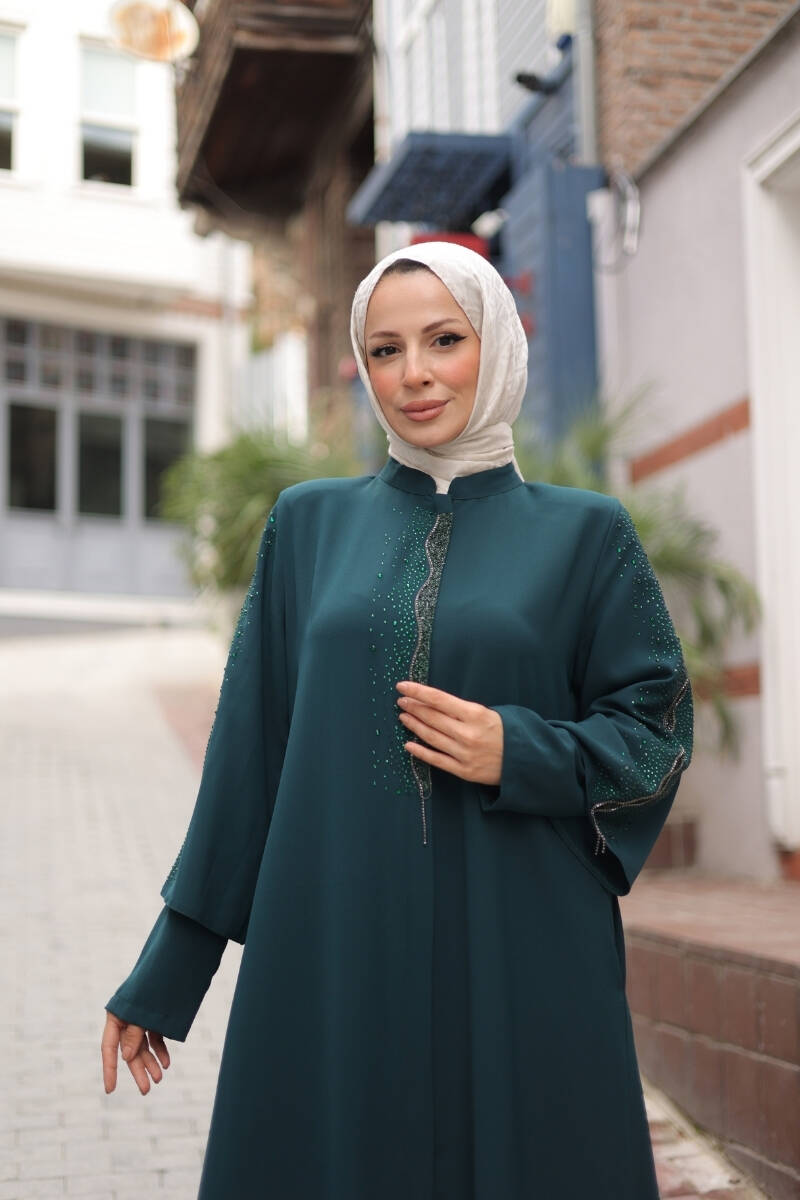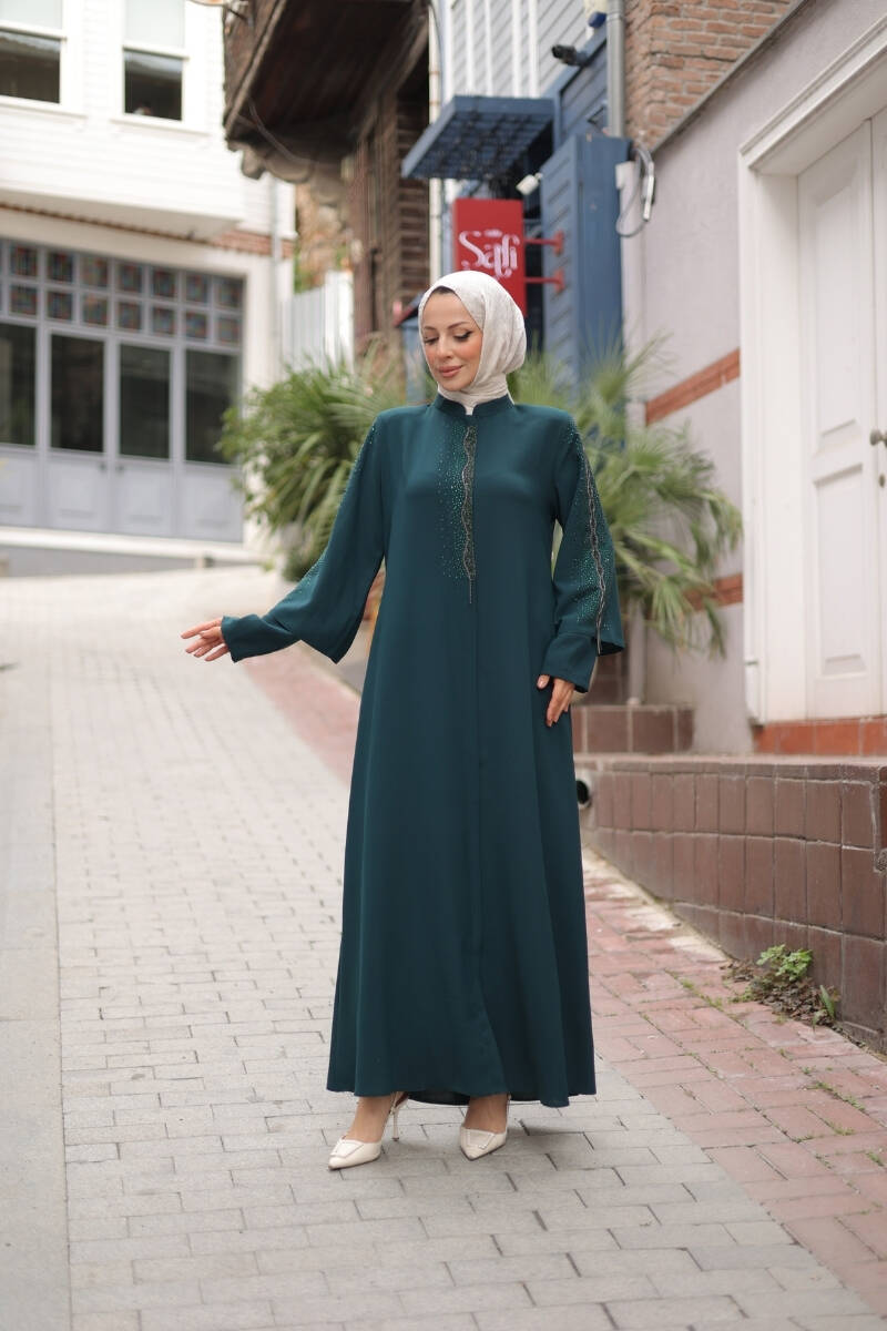 Kol ve ön kısmındaki taş işlemeler, modele ışıltılı bir dokunuş kazandırırken, sade kesimiyle her ortamda zarif bir duruş sergiler. Günlük kullanımdan özel davetlere kadar her anınıza uyum sağlayan bu ferace, rahat kesimiyle özgür hareket imkânı sunar.