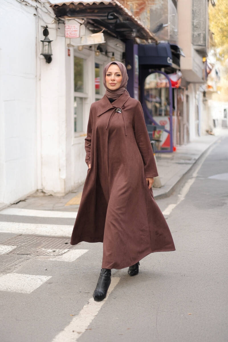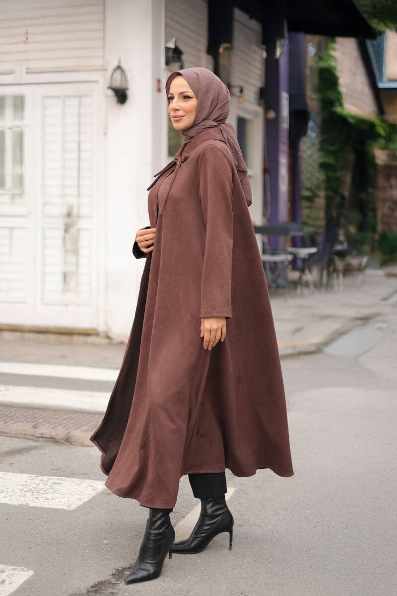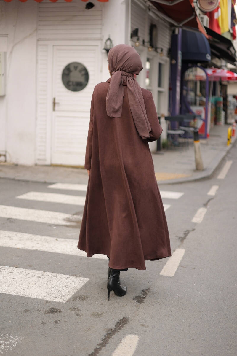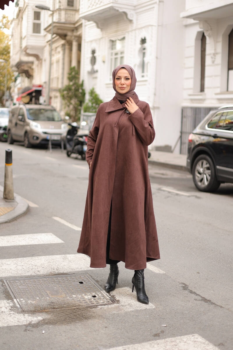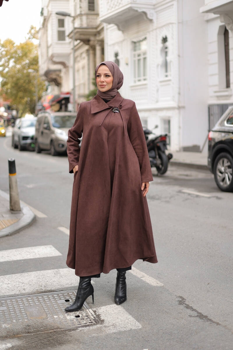 Yumuşak süet dokusu, kaliteli dikiş yapısı ve dökümlü kesimiyle zarif bir görünüm sunar. 130 cm uzunluğundaki model, 38–52 beden aralığında üretilmiş olup, her bedene uyum sağlayan rahat kalıbıyla dikkat çeker.
