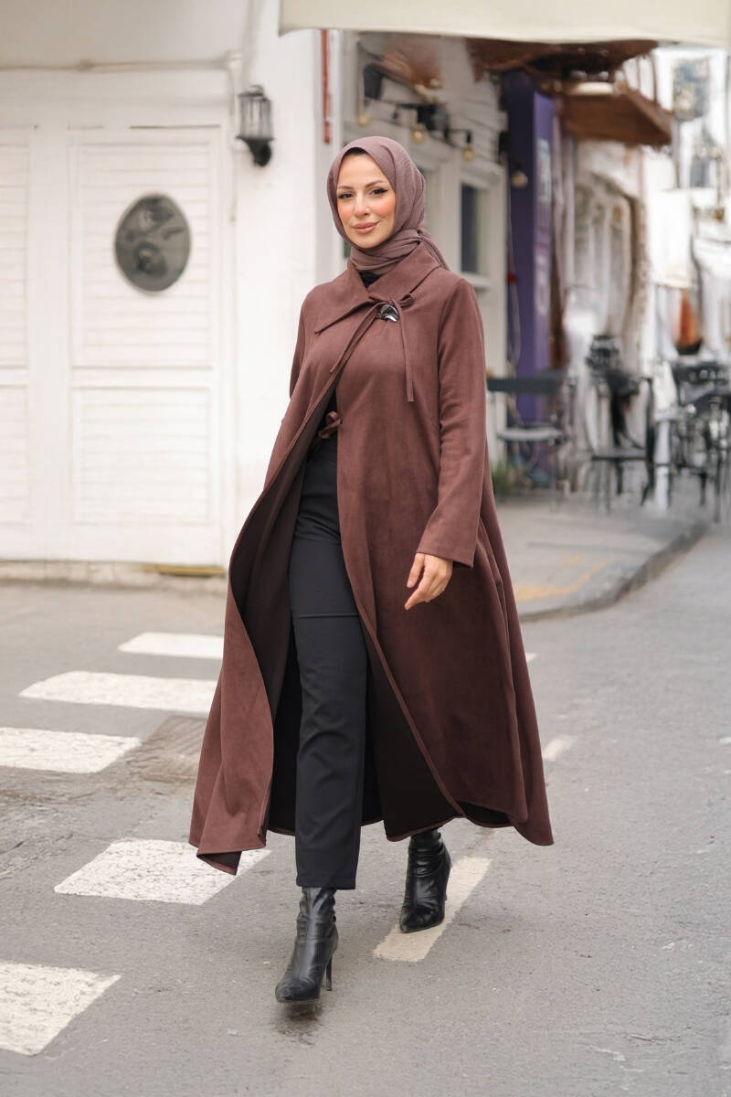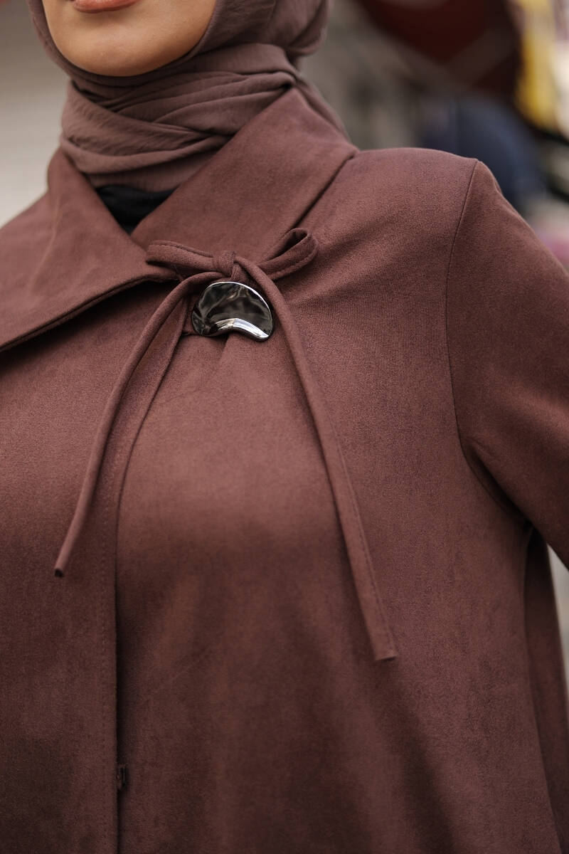 Bağlama detaylı yakasıyla klasik kabanlardan ayrılan tasarım, hem günlük hem özel gün kombinlerinde zarif bir tamamlayıcı olur. Selva Süet Kaban, sonbahar ve kış aylarında tarzınızı bir adım öne taşır.