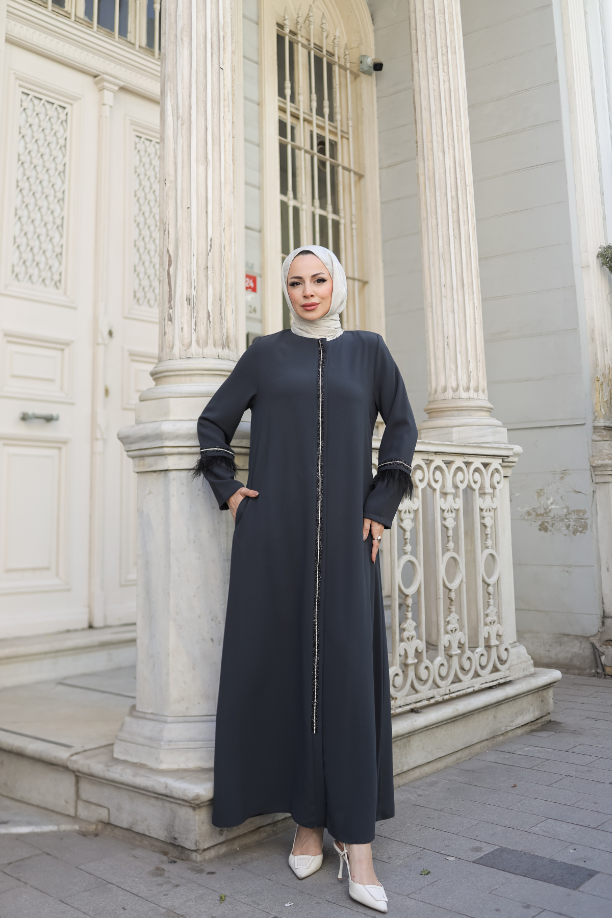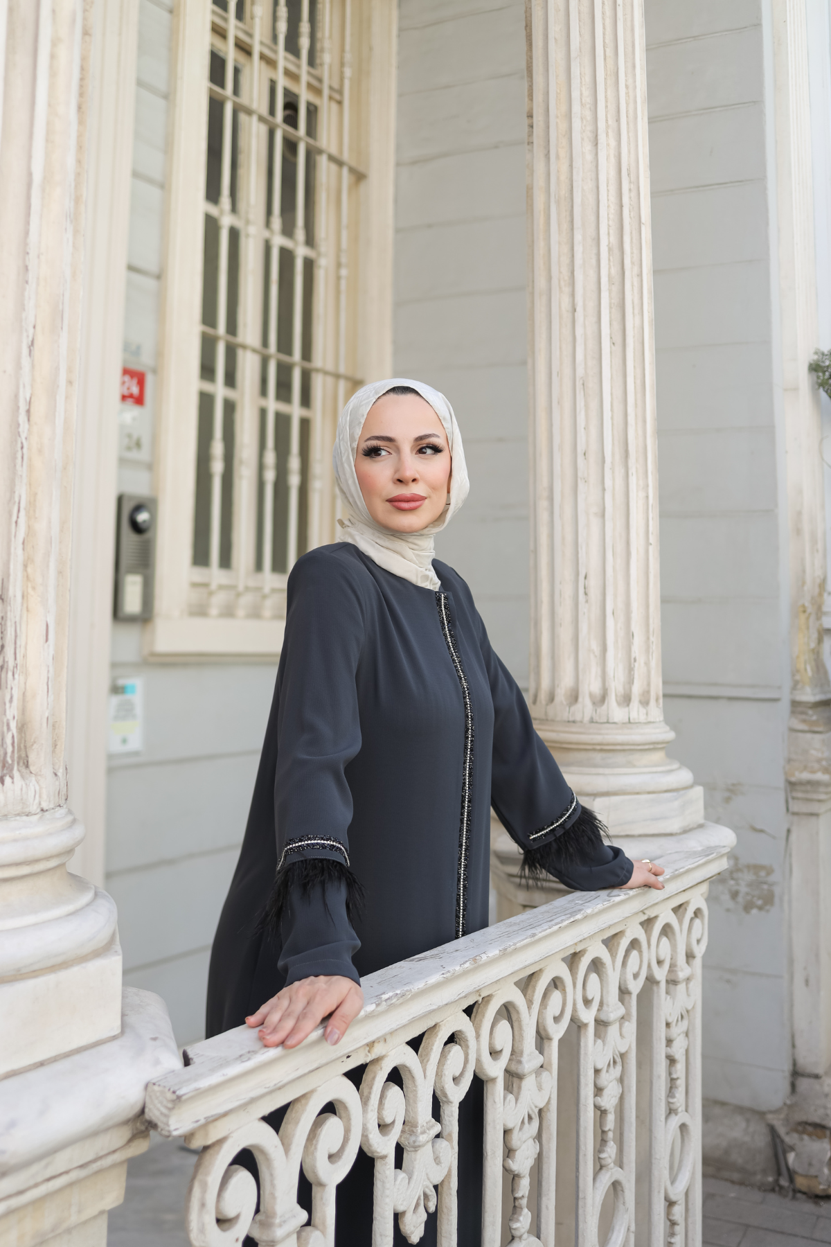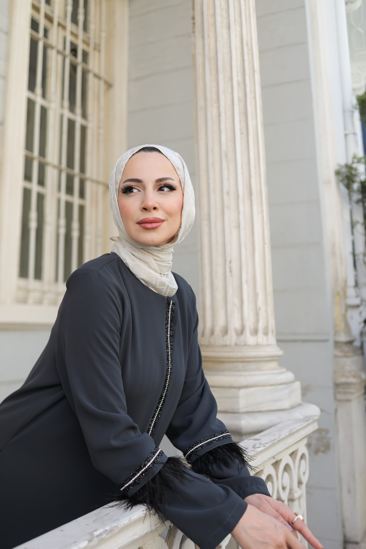 Tüyla ferace, zarif ve şık bir giyim parçasıdır. Kollarındaki tüylü detaylar,feracenin modern ve dikkat çekici bir görünüm kazanmasını sağlar. Petek krepkumaş ise hafif, dökümlü ve nefes alabilir bir yapıya sahiptir; bu da feraceninrahat bir şekilde giyilmesini mümkün kılar. Özellikle sıcak havalarda ferah birkullanım sunarken, şıklığından da ödün vermez. Hem günlük hem de özeletkinliklerde tercih edilebilecek bu model, farklı kombinlerle kolayca uyumsağlar.