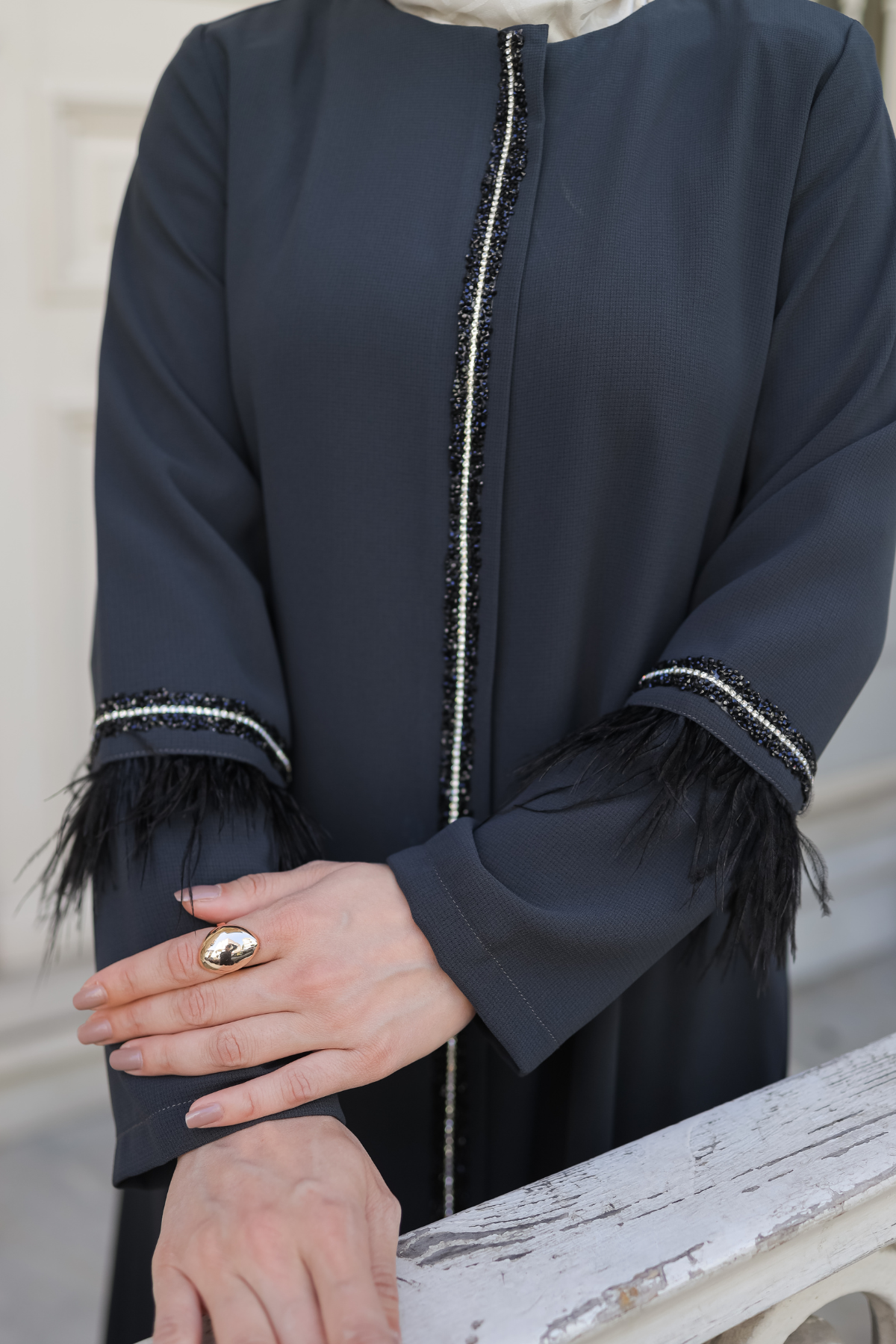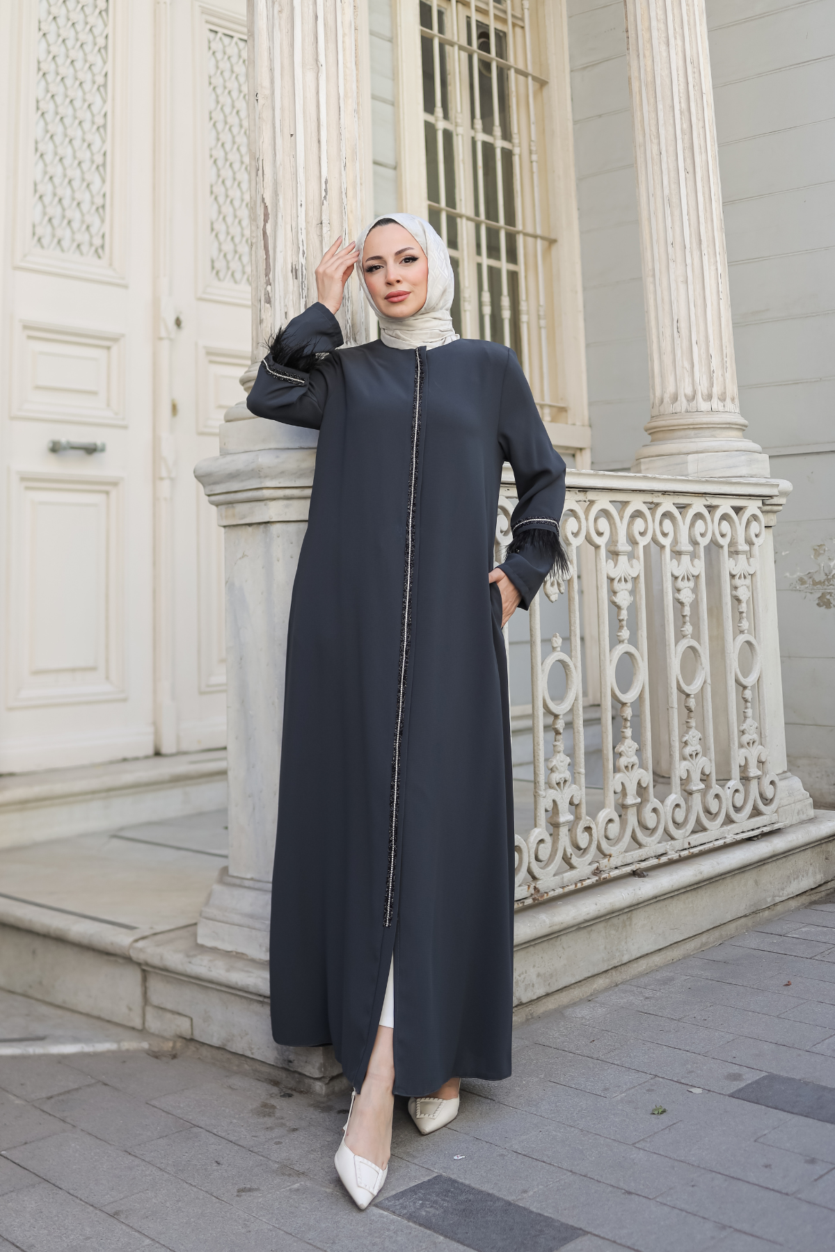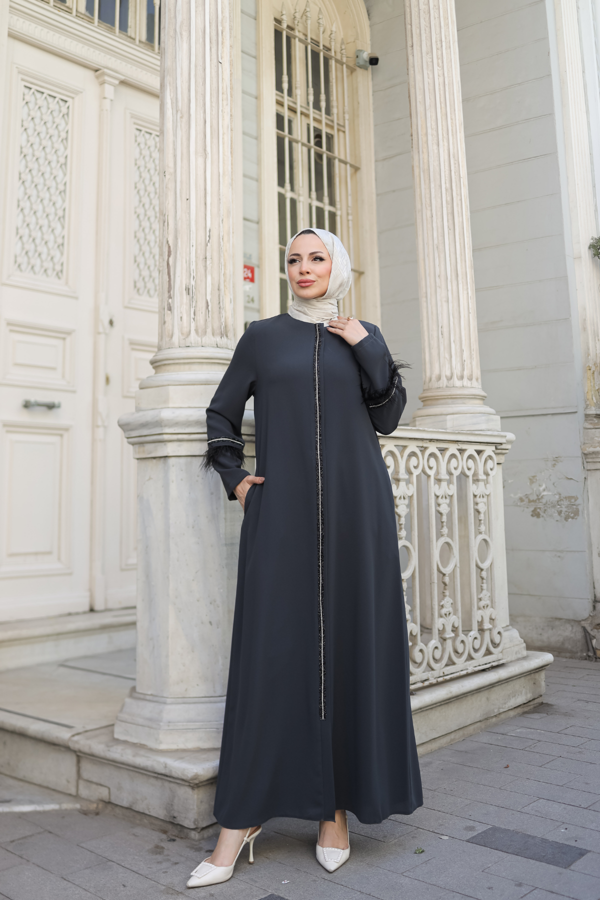 Tüyla ferace, zarif ve şık bir giyim parçasıdır. Kollarındaki tüylü detaylar,feracenin modern ve dikkat çekici bir görünüm kazanmasını sağlar. Petek krepkumaş ise hafif, dökümlü ve nefes alabilir bir yapıya sahiptir; bu da feraceninrahat bir şekilde giyilmesini mümkün kılar. Özellikle sıcak havalarda ferah birkullanım sunarken, şıklığından da ödün vermez. Hem günlük hem de özeletkinliklerde tercih edilebilecek bu model, farklı kombinlerle kolayca uyumsağlar.