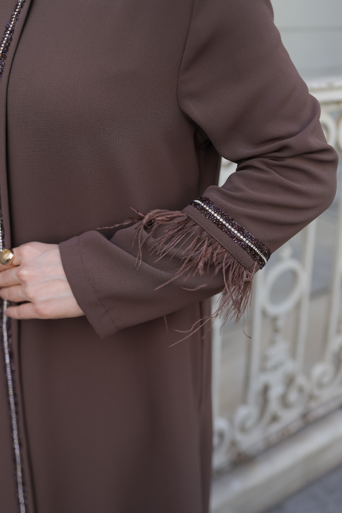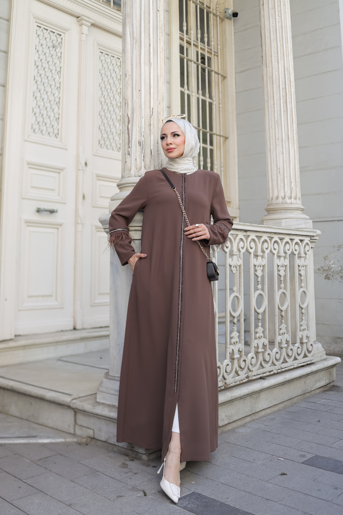 Tüyla ferace, zarif ve şık bir giyim parçasıdır. Kollarındaki tüylü detaylar,feracenin modern ve dikkat çekici bir görünüm kazanmasını sağlar. Petek krepkumaş ise hafif, dökümlü ve nefes alabilir bir yapıya sahiptir; bu da feraceninrahat bir şekilde giyilmesini mümkün kılar. Özellikle sıcak havalarda ferah birkullanım sunarken, şıklığından da ödün vermez. Hem günlük hem de özeletkinliklerde tercih edilebilecek bu model, farklı kombinlerle kolayca uyumsağlar.