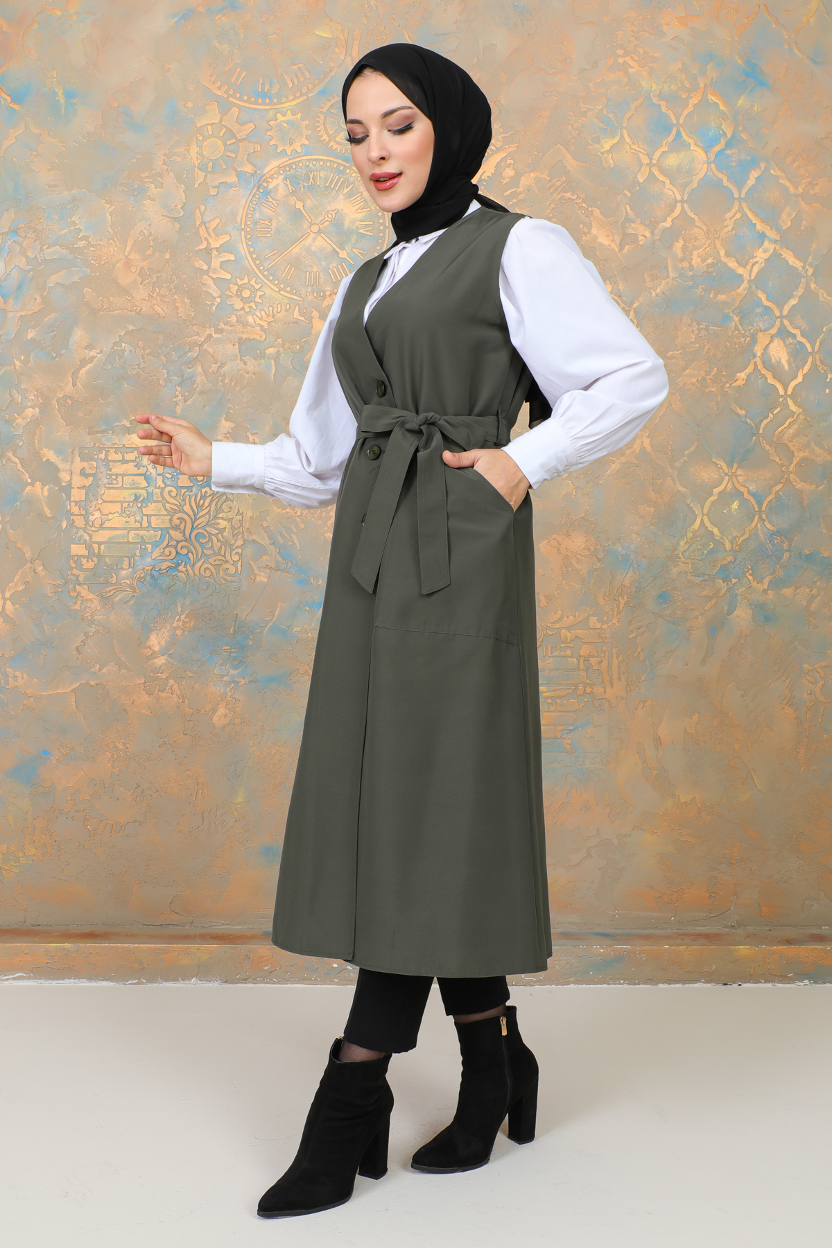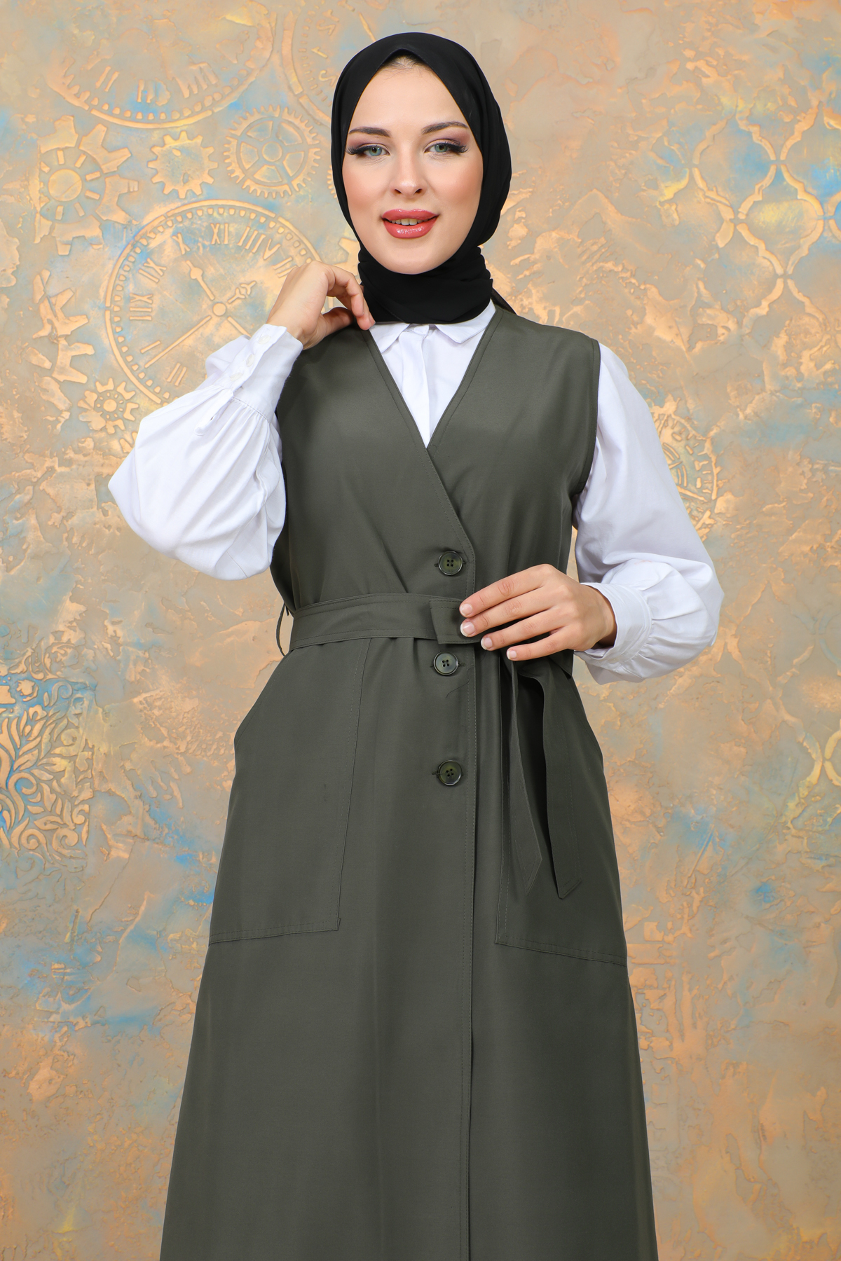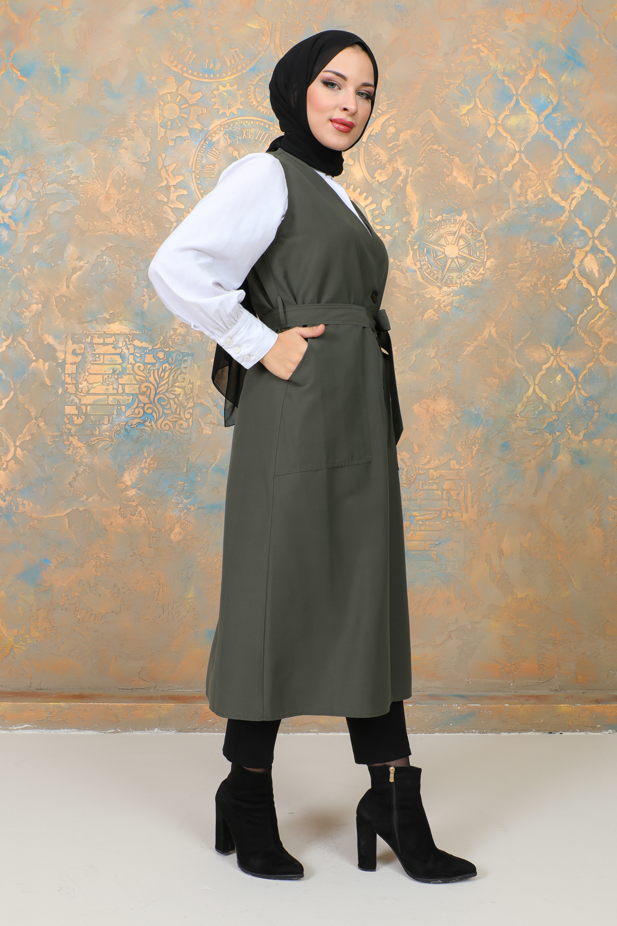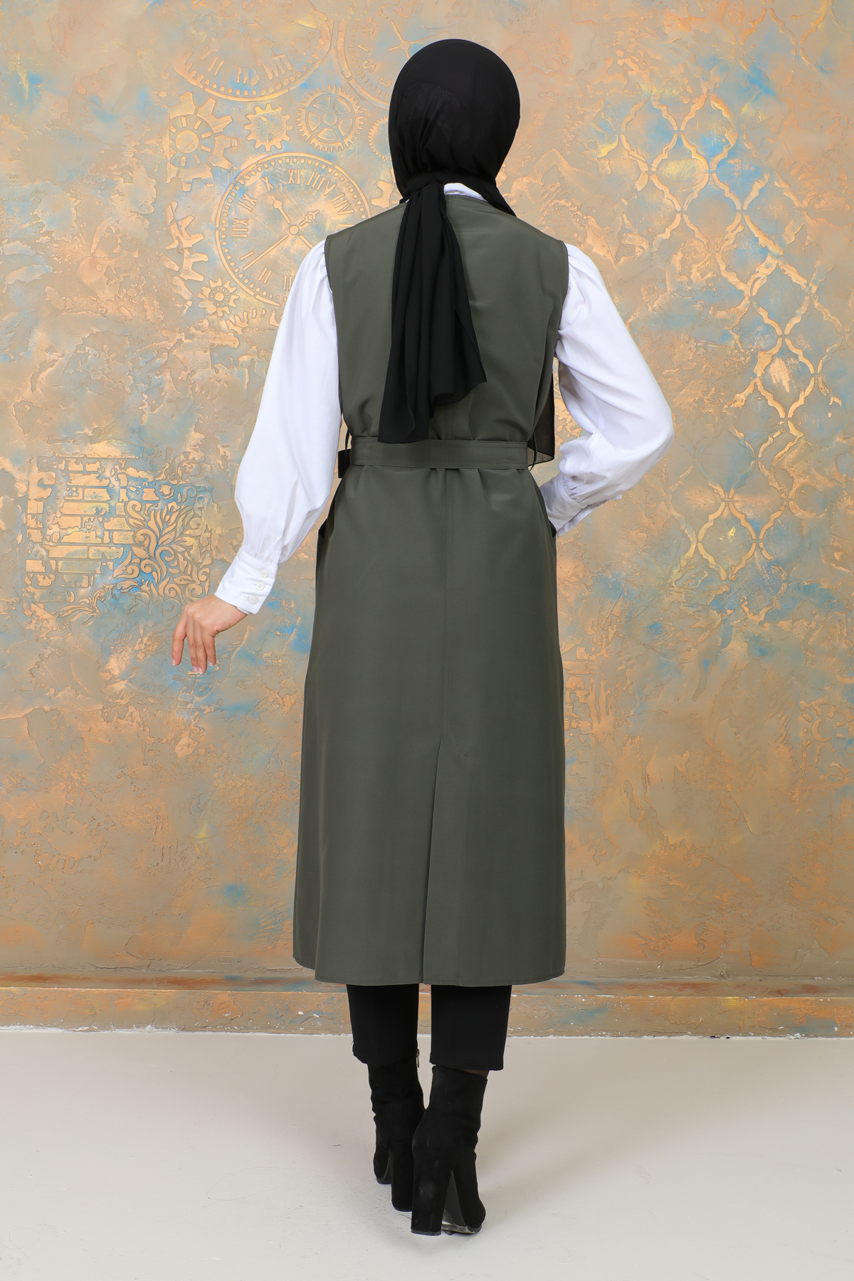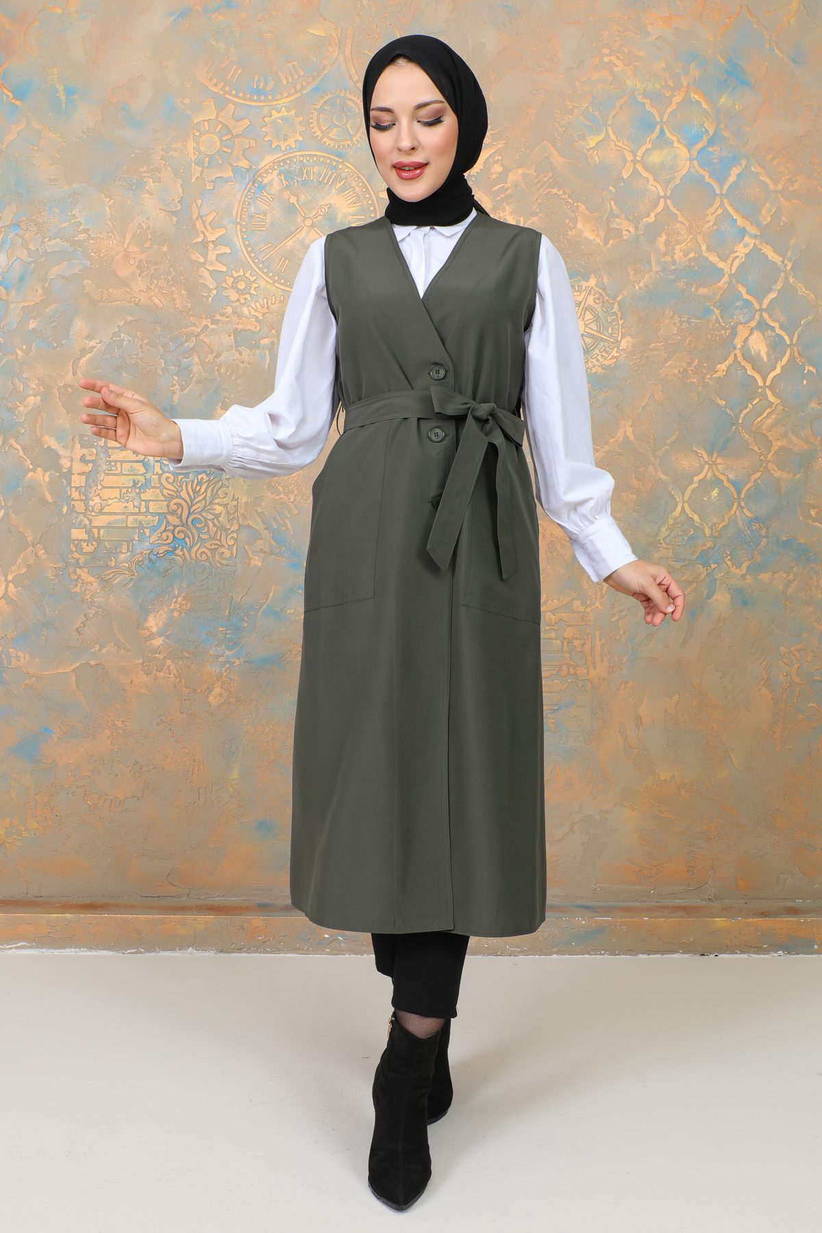 uzun yelek kemerli -TRENÇKOT Haki -10002