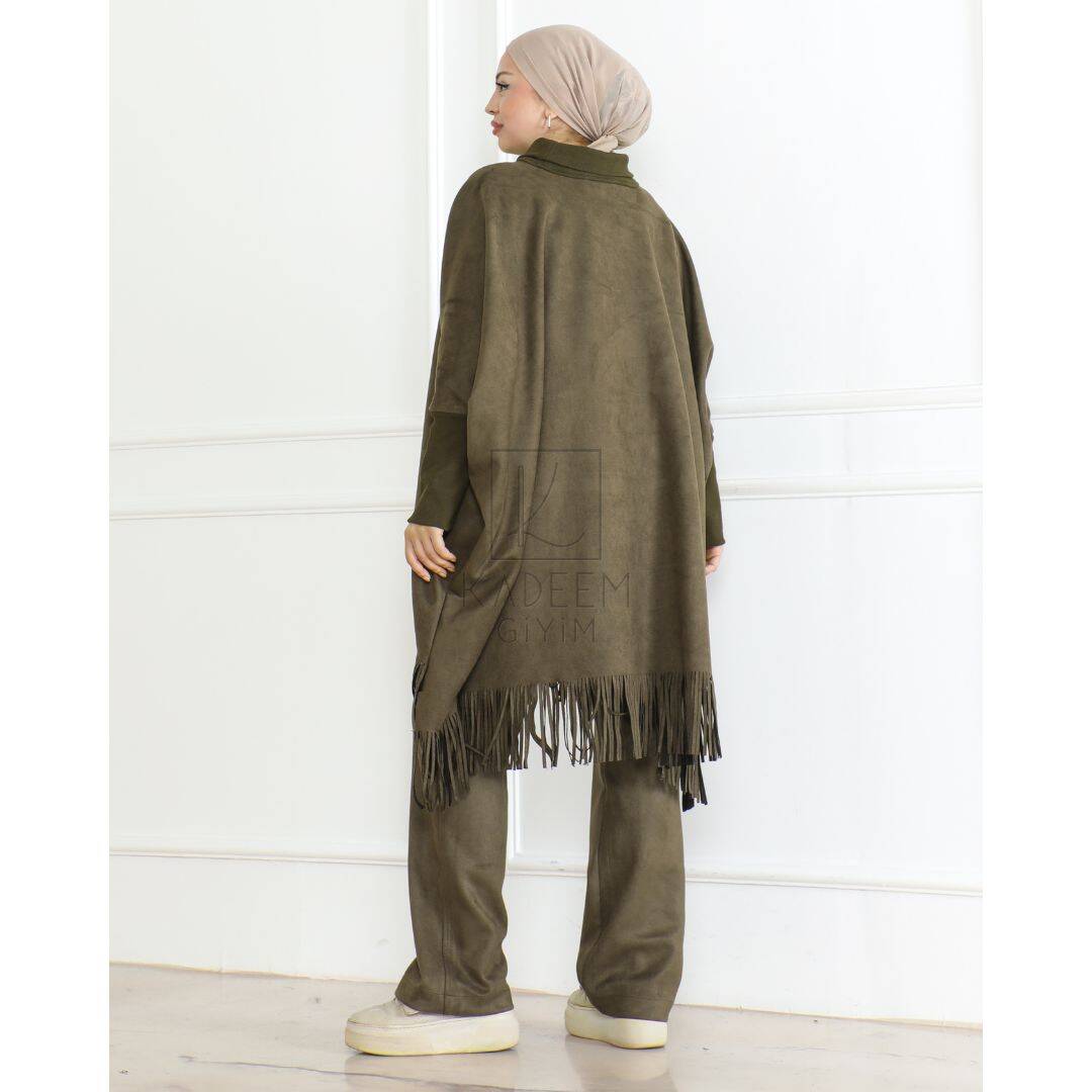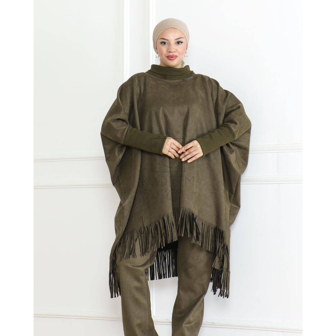 Sadece üst panço olarak tasarlanan model, 102 cm uzunluğu ile tesettür giyime uygundur. Geniş kalıbı sayesinde hareket özgürlüğü sunarken, günlük kombinlerden özel kullanımlara kadar rahatlıkla tercih edilebilir. Pantolon, etek veya takımlar ile kolayca kombinlenebilir.