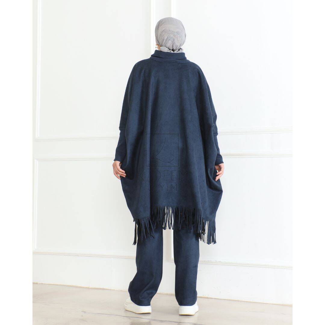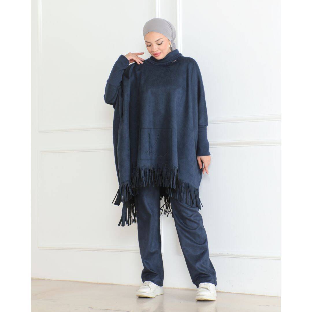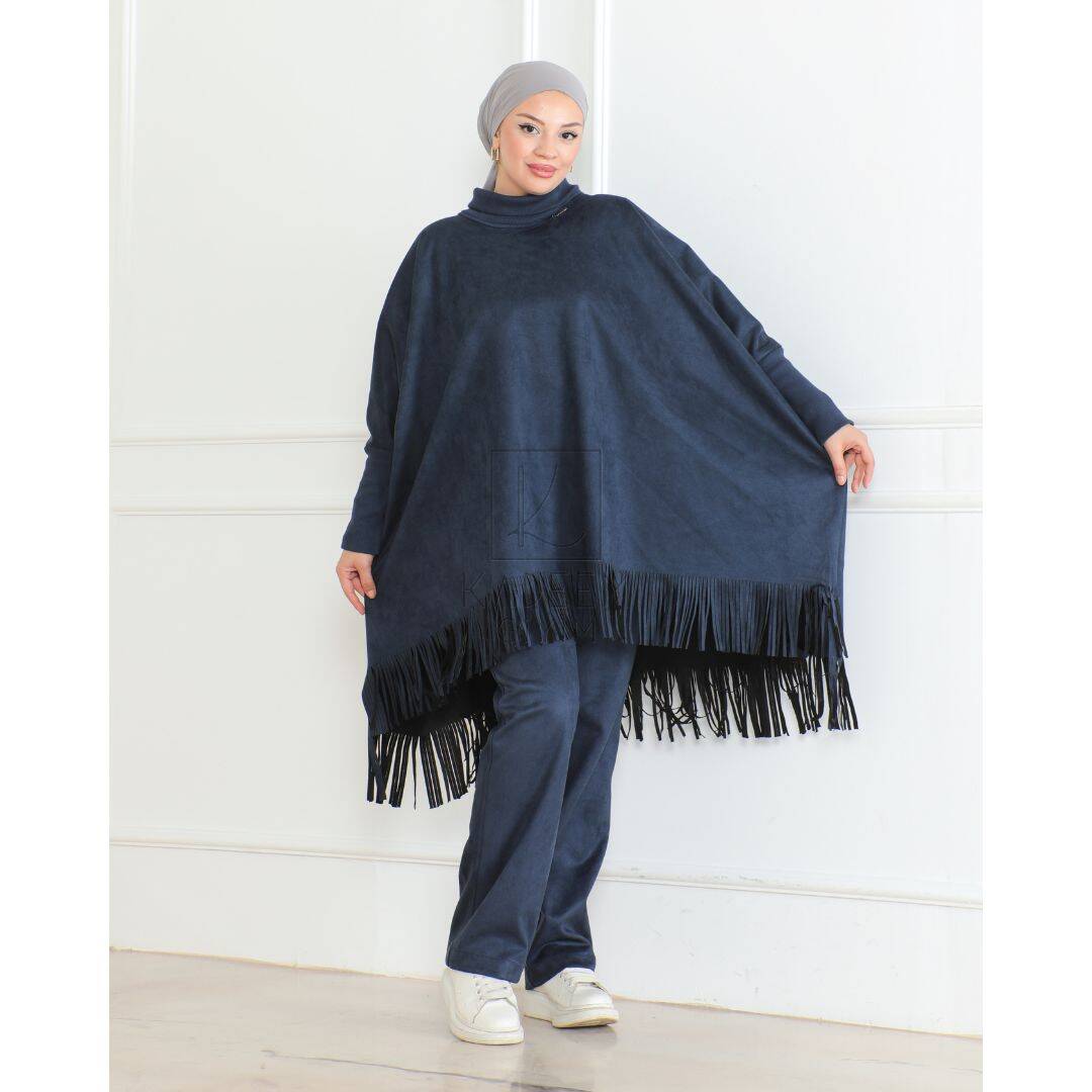 Sadece üst panço olarak tasarlanan model, 102 cm uzunluğu ile tesettür giyime uygundur. Geniş kalıbı sayesinde hareket özgürlüğü sunarken, günlük kombinlerden özel kullanımlara kadar rahatlıkla tercih edilebilir. Pantolon, etek veya takımlar ile kolayca kombinlenebilir.