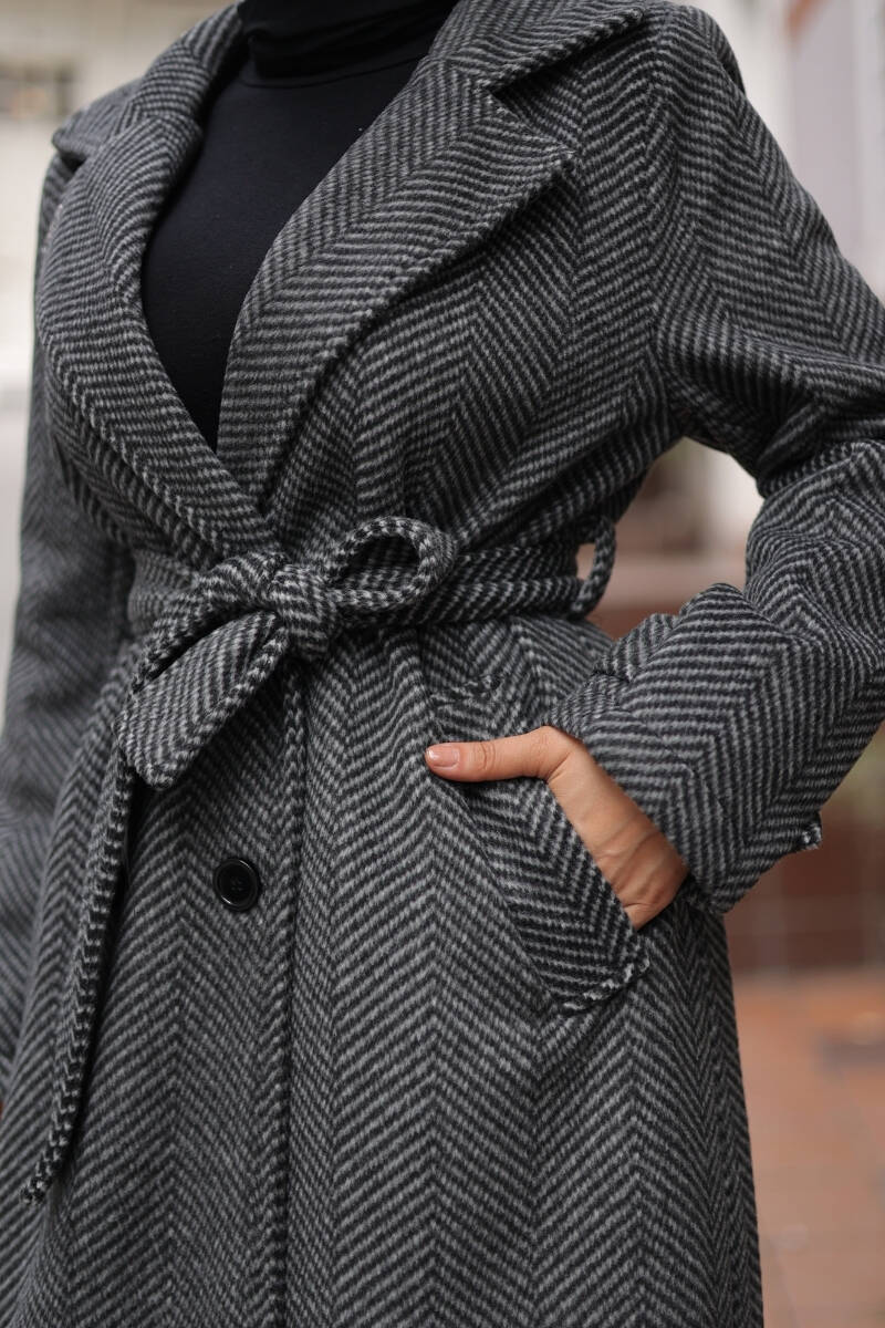 Kemerli tasarımı vücut formunu zarifçe vurgularken, düğme detayları modele sofistike bir hava katar. Soğuk havalarda stilinden ödün vermek istemeyen kadınlar için ideal bir seçimdir.